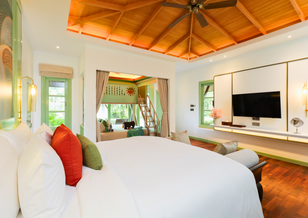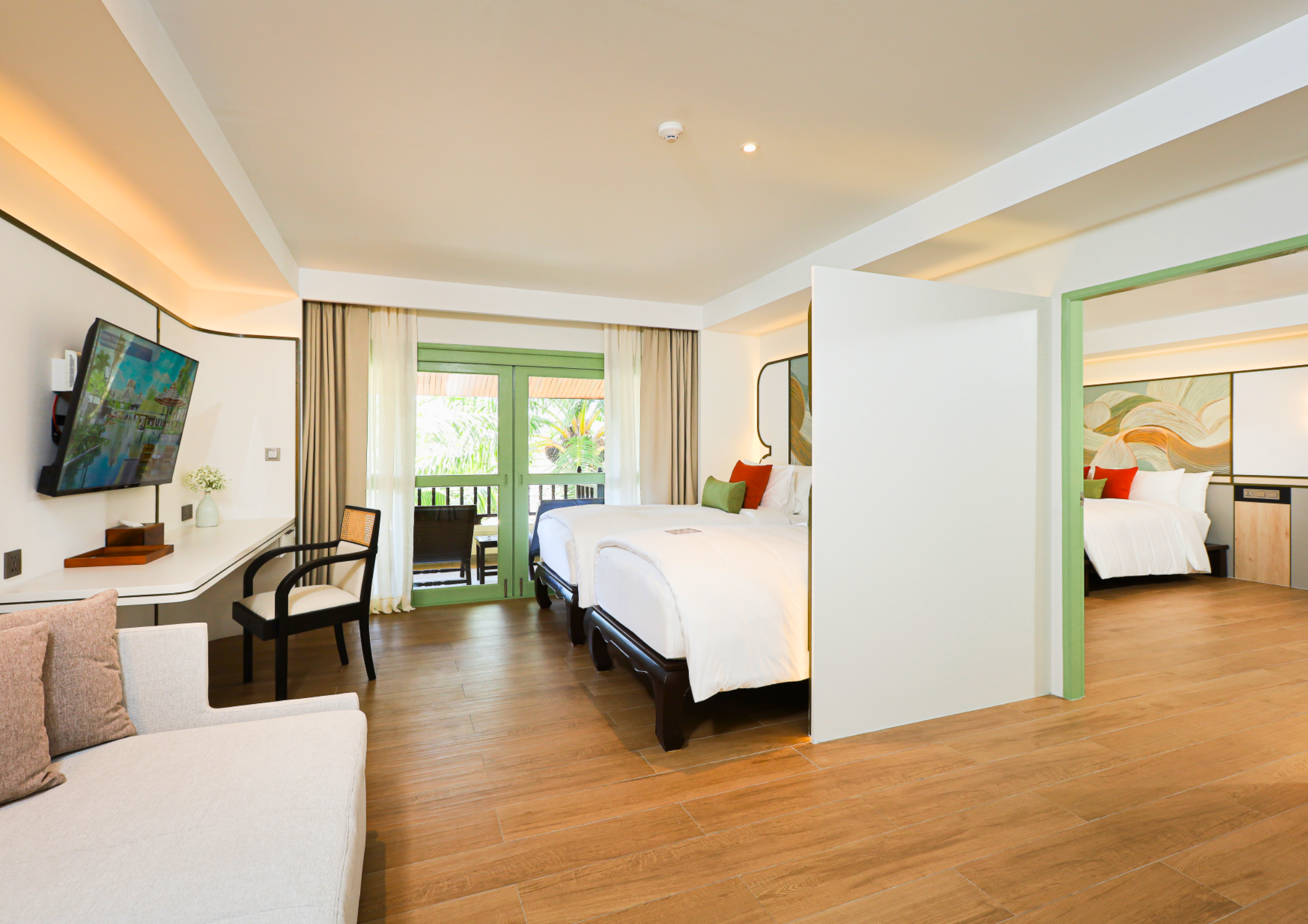 Designed for families or friends, this upper-floor suite features one king and one twin bedroom — offering both comfort and privacy. Soft Thai accents, open wardrobes, and a spacious bathroom complete the relaxed shared stay.
