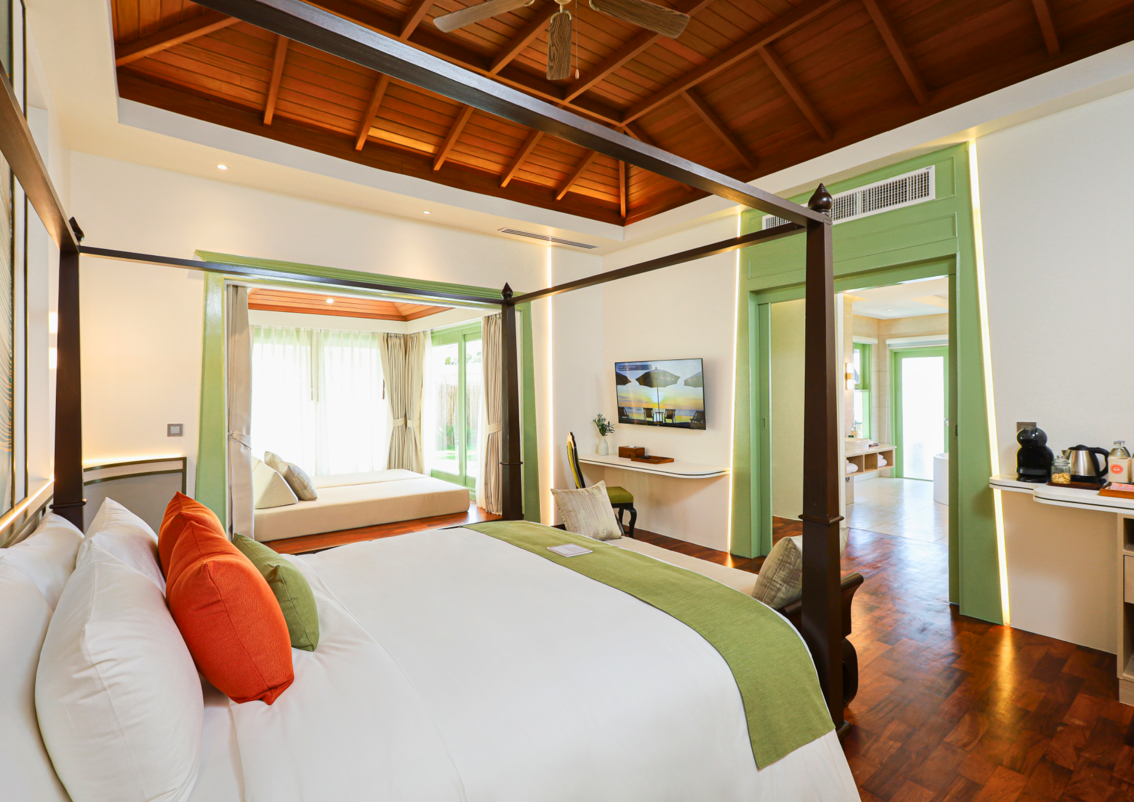 Created for comfort and connection, our Family Villa offers ample living space in a lush garden setting. A cozy daybed corner welcomes little ones to rest and play, while the spacious bathroom, separate tub and rain shower, and private terrace provide everything needed for relaxed family stays.