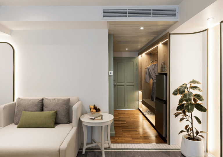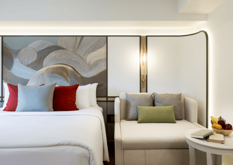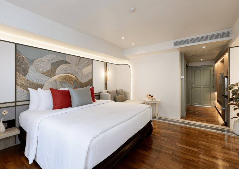Thoughtfully reimagined for comfort and calm, our Deluxe Room blends soft Thai textures with practical design. The expanded living space features a generously cushioned expandable daybed with coffee table, ideal for an additional guest and an open wardrobe that feels airy and intuitive. The bathroom offers double vanities and a generous rain shower. A larger fridge completes the experience, perfect for slow mornings or quiet evenings in.