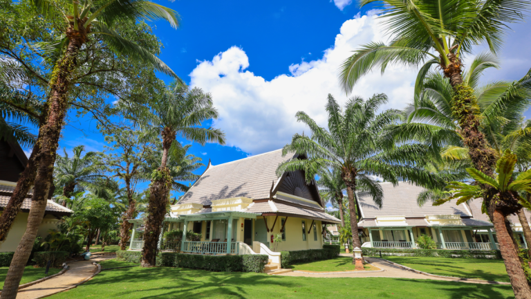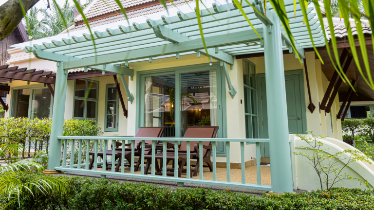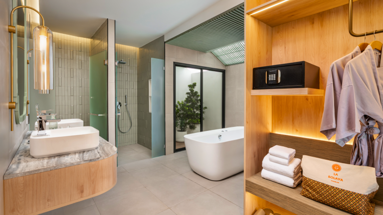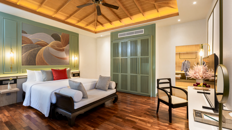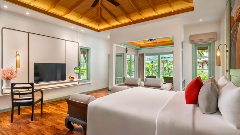 Tucked among tropical gardens, our Deluxe Villa offers peaceful seclusion with generous indoor and outdoor space. The villa features a private terrace and a cozy raised daybed set beside wide windows — perfect as a spacious lounge or sleeping corner for a child or an additional guest. A large bathroom with a separate bathtub and rain shower completes the setting, while warm Thai accents and natural light create a soothing, restful atmosphere.